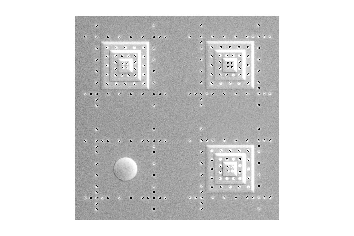 3D Kalibrierstrukturen für die Kalibrierung von 4Q BSD Systemen enthalten ein kugelförmiges Element für die Kalibrierung der vier Detektoren. Dieses Element hat einen Durchmesser von 10 μm und eine Höhe von ca. 1 μm..