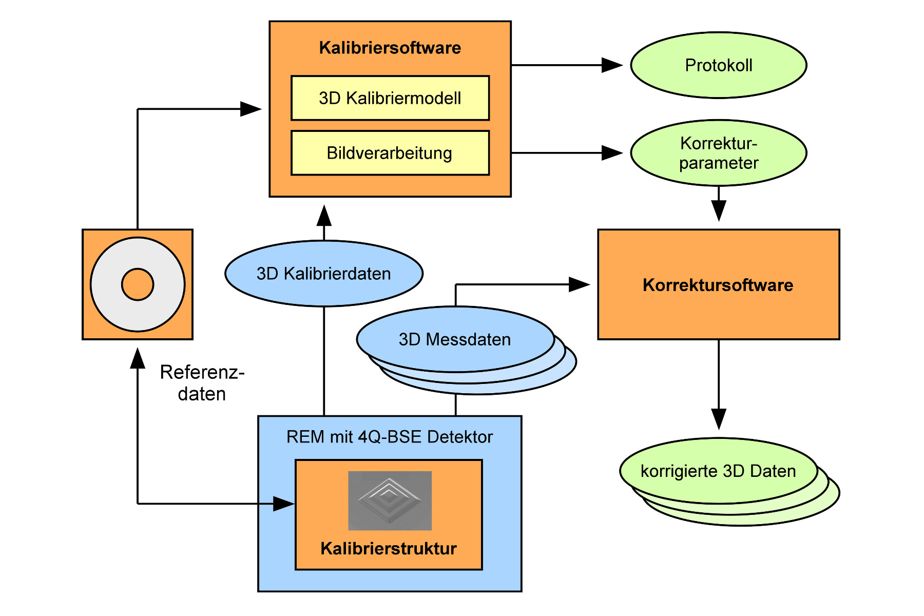 Die Kalibrierstruktur wird mit dem Mikroskop aufgenommen. Die gemessenen 3D Daten werden von der m2c Software importiert, analysiert und mit den Referenzdaten verglichen..