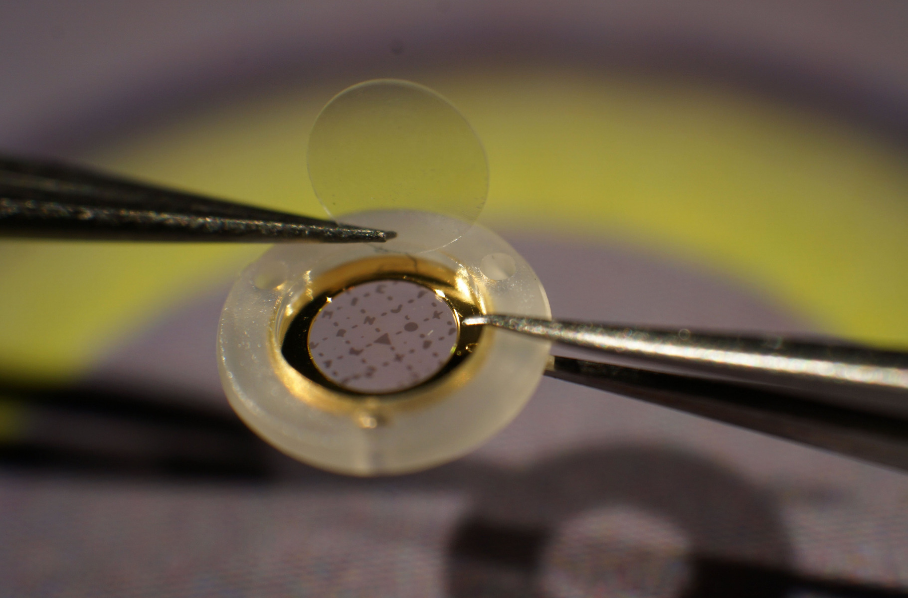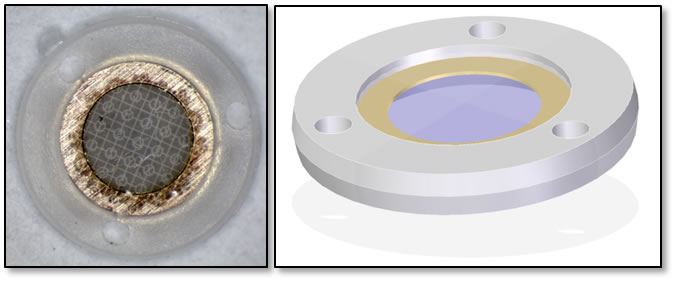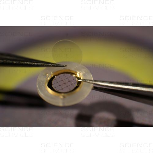 The CryoCapsule® is a new tool in the field of High Pressure Freezing (HPF) and correlative light and electron microscopy (CLEM). Comparable to a small petri dish, it is composed of a landmarked sapphire disc and a gold spacer ring (50µm thick) maintained together by a plastic ring [3].