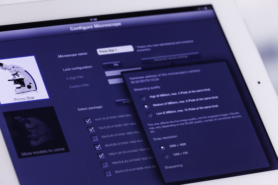 Die die integrierte Ethernet-fähige Kamera des Primostar 3 und Stemi 305 schafft in Verbindung mit der iPad App Labscope die Möglichkeit mehrere Mikroskope in Ihrem Klassen- bzw. Kursraum zu einem Netzwerk zu verbinden. So behalten Sie mittels Livebilder den Überblick über die einzelnen Mikroskope der Schüler und sind in der Lage individuell auf die Bedürfnisse der Schüler einzugehen und sich währenddessen frei im Klassenzimmer zu bewegen.