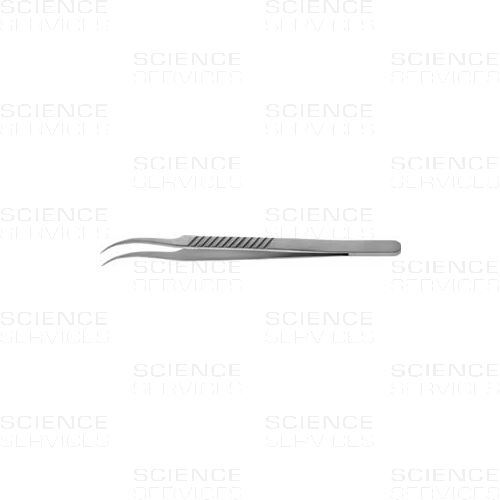 Dumont Pinzette mit superfeinen, gebogenen Spitzen. Extra lang. Spitzenmaße: A: 0,14mm B: 0,24mm. Länge: 150mm