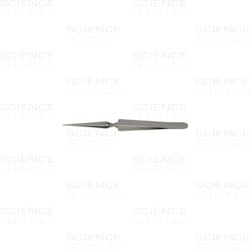 Selbstschliessende Dumont Pinzette mit kurzen, dünnen, superfeinen Spitzen. Spitzenmaße: A: 0,04mm B: 0,08mm, Länge: 108mm