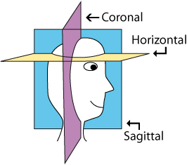 Koronale (coronale) Schnitte: Senkrechte Schnitte in den Frontalebenen. Ergebnis: Man blickt von vorne in den Kopf hinein.
