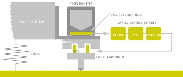 Bei aktiven Antivibrationsplattformen werden die, von extrem empfindlichen Beschleunigungssensoren erfassten, Signale von elektronischen Schaltungen analysiert, die wiederum elektrodynamische Aktuatoren ansteuern, welche sofort eine Gegenkraft erzeugen, um die Vibration zu kompensieren. Man spricht hier auch von aktiver Vibrationskontrolle (AVC).