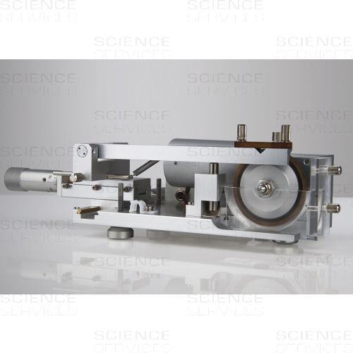 The Model MS 3 Microsaw is driven by an electric motor through a helical transmission. The 12 V DC is provided by the power supply subunit. The speed at which the wheel turns is continuously adjustable. Adjustment of the specimen position, arm contact point, arm tension and the downstop control mechanism is possible. Two adjustment screws at the bottom of the instrument allow positioning of the stand and leveling the Microsaw underneath the stereooptical microscope for precision sectioning.