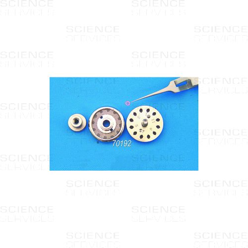 Der Probenhalter ist aus massivem messingvernickelten Stahl gefertigt. Der Bereich für die TEM Grids ist oben und unten mit einem Edelstahlgitter versehen. Dieses Design stellt sicher, dass die Gitter während dem Einbetten und Verarbeitung nicht beschädigt werden. Durch ihre Bauweise und der Materialauswahl sind die Halter sehr robust und widerstehen allen kritischen Bedingungen. Die Probenhalter fassen bis zu 12 TEM Grids. Durch eingravierte Nummern an den Schlitzen, ist eine einwandfreie Zuordnung der Grids jederzeit und einfach möglich. Abmessungen: 24 mm (D) x 24 mm (H)