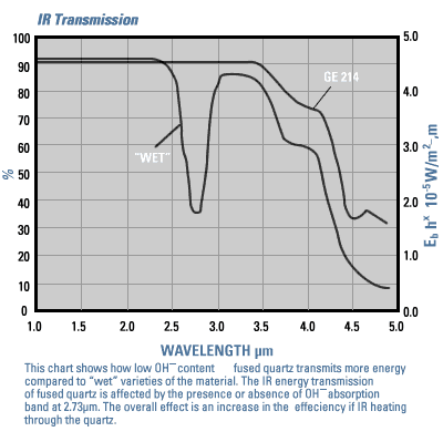 GE 214/124 electrically fused quartz is a very efficient material for the transmission of infrared radiation. Its infrared transmission extends out to about 4µm with little absorption in the 'water band' at 2.73µm. This makes Momentive Performance Materials's electrically fused quartz different than flame fused quartz (often referred to as 'wet' quartz). This difference is seen in the transmission for the IR range. The IR Transmission figure illustrates this difference.