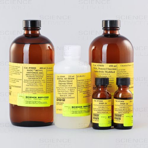 This method uses QUETOL 651 (EMS Catalog #20440) and the epoxy resin, Nonenyl Succinic Anhy-dride (NSA) (EMS Catalog #19050) and NMA (EMS Catalog 19000) as hardener and DMP-30 (EMS Catalog #13600) as accelerator. QUETOL 651 is an ethylene glycol diglycidyl ether, an epoxy resin of low viscosity. It is a light-colored epoxy resin with a viscosity of 15 cps at 25 degrees C. It is readily miscible with water, alcohol, acetone, n-butyl glycidyl ether, etc. It acts as a dehydrating agent, and combines chemically in any cured epoxy resin formulation.