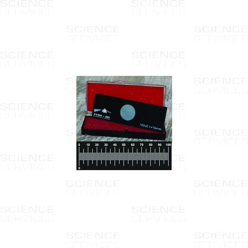 The scale or grid is centred on a glass disc mounted in a black anodised aluminium slide 76mm x25mm x 1.5mm thick. The metal mount gives these stage micrometers greater durability than those of all glass construction. This product is supplied in a plastic case with foam insert.