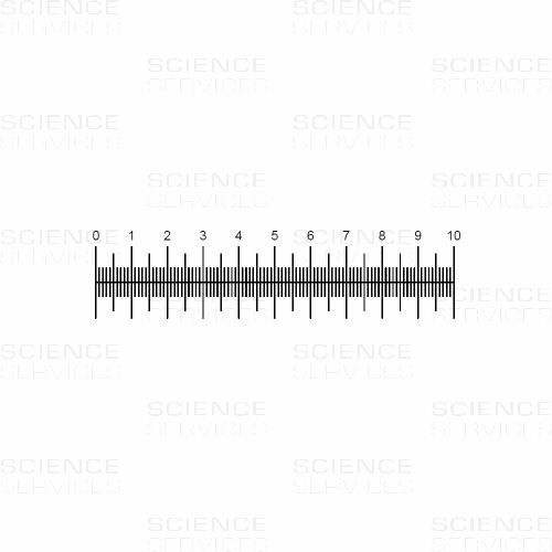 Okularskala aus Polyester mit horizontaler 10mm Skala in 0,1mm Unterteilung. Die Strichplatte ist auf Polyesterfolie gedruckt und kann für Okulare verschiedener Durchmesser bis 27mm zugeschnitten werden. Durch die klebende Folie kann die Skala für viele weitere Anwendung eingesetzt werden. Eine Packung enthält 2 Streifen à 5 Okularskalen.