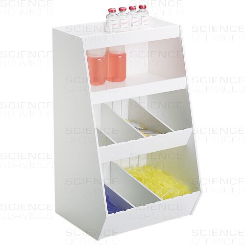 Hergestellt aus PVC, ist das Regal chemisch beständig und hat ein geringes Eigengewicht. Die Fächergröße kann je nach Bedarf durch herausnehmbare Trennstege verändert werden. Eine gute Alternative für die platzsparende Aufbewahrung und Sortierung von kleinen Verbrauchsmaterialien im Labor.