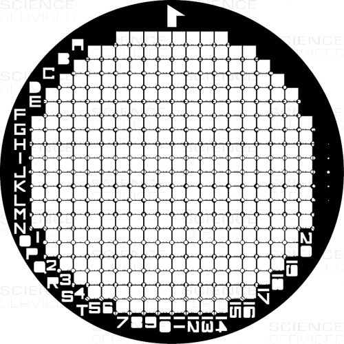 322 Zellen sind durch einen alpha-numerischen Code eindeutig markiert. Mit dem Lichtmikroskop kann der Code aus Buchstaben (Reihen) und Zahlen (Spalten) erkannt werden. Im Elektronenmikroskop ist der Buchstabe unten links in der Zelle zu sehen.