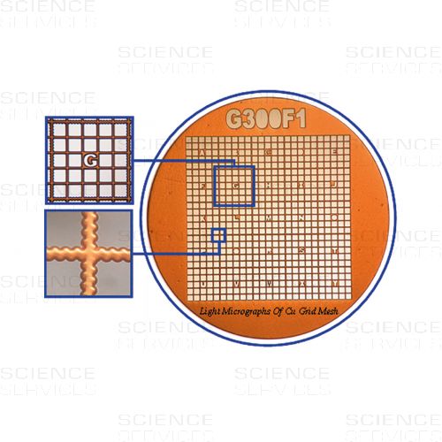 Die G300F1 Finder TEM-Grids sind in 625 Zellen unterteilt, welche in 25 Sets zusammengefasst sind. Jedes Set fasst 5x5 Zellen, ist im Zentrum mit einem Buchstaben von A-Y markiert und von geschwungenen, dickeren Stegen umrandet.