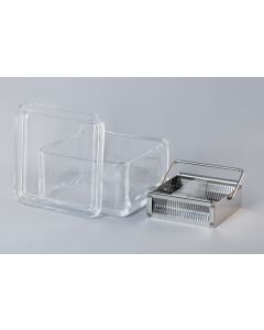 Färbetrog für 50 Objektträger der Größe 75x25mm, 75x38mm oder 75x51mm. Hergestellt aus rostfreiem Stahl, beständig gegen die meisten Färbelösungen. Der Griff ist fest mit dem Gestell verbunden.ab 158,30 € 188,38 €