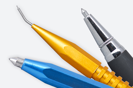Durch die Schraubklemmvorrichtung können verschiedene bis 2mm breite Diamantritzstifte eingespannt werden. Mit Spannzangenadapter für dünnere Stifte bis 0.8mm.