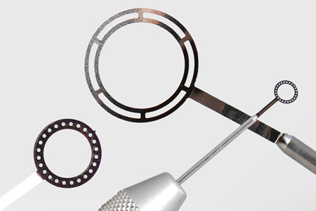 Die Probenstanze eignet sich zum Ausstanzen für 3mm Proben z.B. für die Transmissions-elektronemikroskopie (TEM). Mit der Präzisionsstanze können Probenscheiben mit Stärken zwischen 10µm und 200µm ausgeschnitten werden. Die Proben werden von einem Auswurfstempel in einen kleinen Auffangkorb gelegt. Gefügeveränderungen im Zentralbereich der Probe werden durch die spezielle Form des Stempels verhindert.