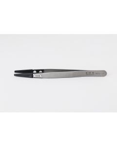 Pinzette mit flachen, breiten Spitzen. Spitzenmasse: Breite 1,8mm, Gesamthöhe 1,0mm. Länge 130mm. Griffe aus antimagnetischem Stahl (SA), Spitzen aus PEEK.