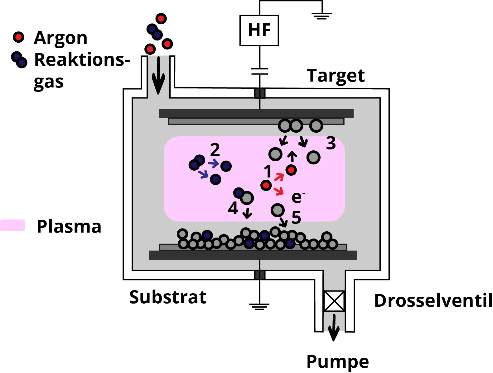 Unter Vakuum wird beim Sputterprozess, meist durch eine hohe Wechselspannung, ein Niedrigdruck-Plasma erzeugt, es bilden sich ionisierte Gas-Atome. Diese werden unter hoher Spannung auf ein Target beschleunigt. Beim Aufprall werden Atome und Cluster mit hoher ballistischer Energie (typischer Weise bis zu 10 eV) aus dem Target gelöst die sich dann auf dem zu beschichtenden Objekt niederschlagen. Dies führt beim Sputtern zu einer guten Oberflächenhaftung, im Vergleich zu anderen Dünnfilmbeschichtungsmethoden, auf den meisten Oberflächen.
